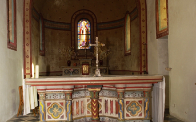 A l’entrée du choeur, l’autel néo-roman, riche en couleurs, était précédemment situé au fond de l’abside centrale, il fut avancé pour permettre la célébration face au peuple.
